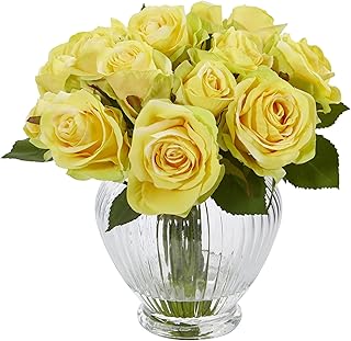 Nearly Natural Rose Floral エレガントなガラス花瓶 9インチ イエロー